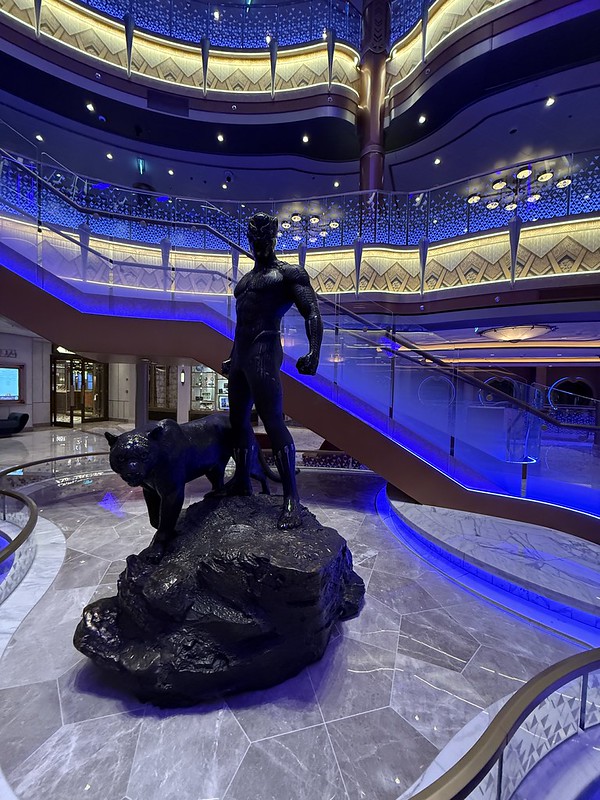 From the moment you step aboard the Disney Destiny, you’re transported into a dynamic world inspired by Marvel Studios’ Black Panther. The striking three-story Grand Hall serves as both a gathering spot and entertainment hub, featuring imaginative design details crafted by Walt Disney Imagineers. Inspired by Wakanda’s banded armor and iconic jewelry, the metalwork on the pillars resonates with authenticity. Above, a breathtaking chandelier mimics Vibranium’s shimmering effect, while geometric patterns echo Queen Ramonda’s crown. A stunning statue of T’Challa—the Black Panther himself—presides over the space, setting the tone for a heroic voyage ahead.